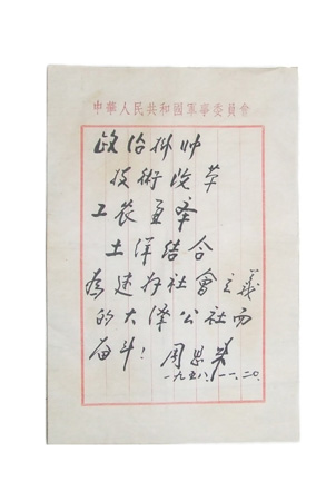 記者從辛先生提供的照片上看到,手跡為9橫行題詞,用毛筆寫在中華人民共和國軍事委員會16開信箋上,信箋為宣紙。內容為:政治掛帥、技術改革、工農并舉、土洋結合,為建好社會主義的大澤公社而奮斗!(記者 胡紅波)