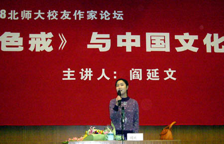 日前,女作家閻延文應母校北師大文學院邀請,在北師大針對文化熱點問題,進行了一場題為《色戒與中國文化》的講座。英東學術(shù)會堂,在講座開始前即已爆滿,兩個小時的講座始終處在熱烈氣氛中。