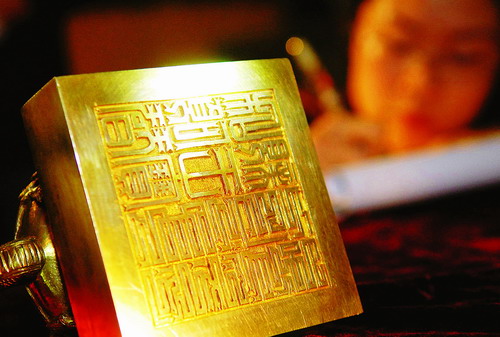你能想到一方金印的最大重量是多少?昨天,在武漢市博物館的文物點(diǎn)交現(xiàn)場(chǎng),嘉慶皇帝冊(cè)封當(dāng)時(shí)還是皇子的道光帝為智親王時(shí)所頒授的10公斤重的“和碩智親王”金印引起眾人驚嘆。“曾有一位南京博物院工作人員要將此印拿起,居然連試了2次都沒(méi)成功,這金印可重著呢。”現(xiàn)場(chǎng)文物專(zhuān)家介紹說(shuō),除“和碩智親王”金印,此次點(diǎn)交文物還有皇帝金發(fā)塔、青花十二月花卉杯、銅琺瑯太平有象等,件件彌足珍貴。