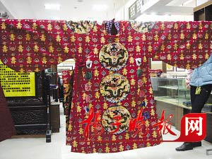 細看款式,圓領(lǐng),大袖,窄袖口,全身繡的“壽”字多達256個,與“福”諧音的蝙蝠有301只,如意紋271個,寓意“福壽萬代”。“袞服”身長136厘米,下擺寬150厘米,肥肥大大,據(jù)說是皇帝最隆重的衣服,明代崇尚紅色,朱元璋規(guī)定“正旦、冬至、圣節(jié)日(皇帝生日)、祭社稷、先農(nóng)、冊拜等大典穿袞服”。明朝對袞服的織造一般由內(nèi)織染局承辦,織造前先由欽天監(jiān)選擇吉日,再由禮部提請,遣大臣祭告,方可開工。