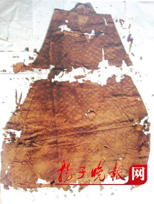 照片中,一堆已經(jīng)損壞的咖啡色織物,殘缺不全、圖案斷續(xù)、毫無光澤,就好像枯萎的花朵一般。如果不是專家介紹,沒有人會將它們和明代皇帝、云錦聯(lián)系在一起。這件“中單”出土于萬歷帝棺內(nèi)中部中間,剛剛出土時,是金光閃閃的,但是在與空氣接觸后,迅速氧化、褪色。通過云錦研究所的復制,記者見識了“紅八寶四合云紋綢交領(lǐng)中單”當年的風采,“中單”無袖,里與面之間夾了一層薄棉絮,凸于表面的紋樣是象征“物華天寶”的八寶紋。據(jù)介紹,此件“中單”類似于現(xiàn)代的襯衫,“小衣之外、大衣之中”,尺寸一般小于袞服、龍袍一寸,長四尺。