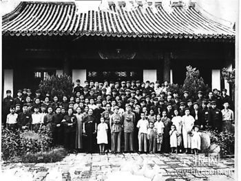 這張老照片可不是大戶人家的集體合影,而是一張不同尋常的結(jié)婚照。其不尋常之處在于:它反映了北京和平解放后,第一個(gè)新式婚禮的隆重場面。照片中間位置胸戴大紅花,表情有些羞澀的一對新人正是新式婚禮的主角。