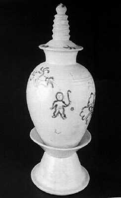 出土的兩件唐代青花塔形罐在同一墓室中,形狀相同,由蓋、罐、底座三部分組成,白瓷胎。器蓋呈塔剎狀,剎座為一覆碟剎身。一罐身飾“童子打曲棍球”、牡丹圖案,另一罐上則飾有萬字符等紋樣。罐身所繪“曲棍球”圖案引人注目,圖案中的人物叉腿而立,右腿微曲,左手揚(yáng)彎形球桿,左側(cè)有一圓球,形象生動(dòng)。