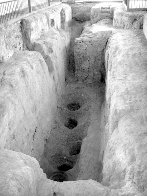 新鄭市博物館館長杜平安介紹說,長方形豎井底部南北長8.7米,東西寬2.5米,深2.24~3.35米,在地下室的東南角筑有一條斜長7.3米、寬0.58~0.7米,共有13級臺階的通道,傾斜度為50度。“這種深入地下3米多,四壁又用夯土建筑,進(jìn)入地下通道又窄又陡的建筑設(shè)計(jì),是出于保持地下溫度低于地上溫度而考慮的。”