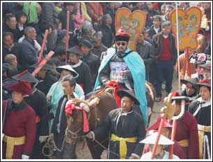 昨天清晨7點(diǎn)不到,侯官寨村的6000余位村民就早早地?cái)D到了門外,有說有笑地等待著“牛老爺”大駕光臨,就連房頂上、門樓里都站滿了努力伸著脖子往遠(yuǎn)處張望的鄉(xiāng)黨。原來,昨天正是一年一度的“牛老爺社火”開耍的日子,整個(gè)村子都沉浸在熱鬧的社火氣氛中。
