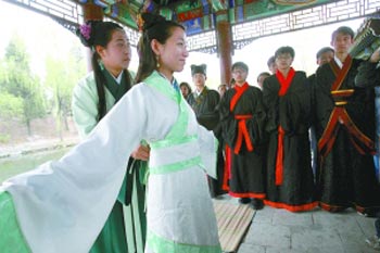 兩名女大學生正在展示漢服。昨日,20多名女大學生相聚清華大學,她們身著傳統漢服,演示了古代女子的成人禮———笄禮。女學生們進行了三次叩拜,拜天地、拜父母、拜祖國;三次加裝,服飾一次比一次華貴,象征女子成長的過程。最后經過上香、敬酒等多個程序,成人禮才宣告結束。笄禮是古代女子訂婚以后、出嫁之前所行的禮,目的是對她們的人生責任、社會角色進行提醒。