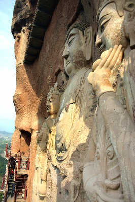 據甘肅省文物局介紹說,已經探明麥積山石窟受損主要集中于石窟中的泥質雕塑,有佛像左臂肘部出現裂縫,另有佛像手腕部出現移位。麥積山數百個石龕中,薈萃著上迄后秦下至清朝的十多個朝代的各種塑像。石窟凌空鑿于20至70米高的懸崖峭壁上,內部的各式人物塑像達7200余尊,由于山體天然石材不宜雕刻,所以石窟內雕塑多為泥塑,而山泥的材質也令原本就飽受歷史風霜的塑像未能幸免。但讓人頗感欣慰的是,到目前為止,麥積山山體上的建筑未出現明顯受損情況。麥積山石窟開鑿于懸崖峭壁之上,其洞窟“密如蜂房”,棧道“凌空飛架”,層層相疊,如此驚險陡峻立體建筑群能夠抵抗8級大震,足見設計者之巧心奇思。為避免文物遭受更大損失,麥積山管理處已對石窟進行了特別加固處理。由于300公里長地震帶以北的甘肅省目前仍處于防余震警戒階段,故眼下還不宜對文物展開修復,文物保護單位目前主要實施臨時性防護措施,待余震高發期過去后,有關方面將會制定合理方案對文物進行修復。