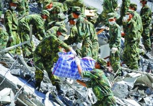 昨日,成都軍區駐滇某部官兵在北川縣檔案館廢墟中搶救檔案。新華社記者 戴旭明 攝