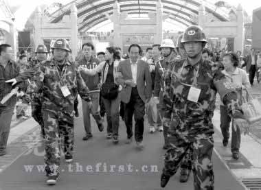 講座全部結束時,為使閻崇年能穿過人群順利到達方澤壇北門的休息室,約有十幾名安保人員為其開道,幾乎是“架”著閻崇年離開會場,不時有熱情的讀者欲遞過書簽名,但是卻完全不能接近。