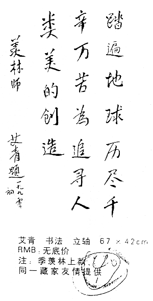 昨日,艾青妻子看到“金兆拍賣圖錄”復印件中艾青的書法作品后告訴本報,這幅作品可以百分之百肯定為假的,“從哪方面來說都是假的,艾青和季羨林沒什么交往,從字跡來說是假的,從年代上來說也不可能。”