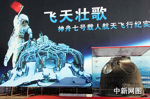 中新網北京11月9日電 (記者 孫自法)以“再現‘神七’飛天全過程 記錄漫步太空經典時刻”為主題的《飛天壯歌——神舟七號載人航天飛行紀實攝影展覽》,九日在北京中國人民革命軍事博物館開幕。