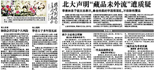 此外,張衡還透露,自己手中還有從拍賣公司買回的國(guó)內(nèi)著名書畫家送給北大百年校慶的一些書法作品,但都是仿制品,“這說(shuō)明北大有人已與社會(huì)上的人勾結(jié)起來(lái)仿制一些書畫,我之所以買下,是為了立此存證”。