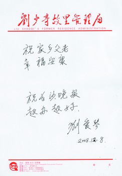 今年11月24日是劉少奇誕辰110周年,此次來參加紀念活動以及昨日追憶活動的劉愛琴是近五年來第一次回家鄉。“家鄉變化很大,發展也很好,如果父親看到這些變化,相信也會感到很欣慰的。”劉愛琴說。對家鄉父老,劉愛琴深深牽掛。昨日在劉少奇紀念館,劉愛琴專門托本報向家鄉父老問好,書寫了“祝家鄉父老幸福安康”,同時寄語本報:“祝長沙晚報越辦越好”。