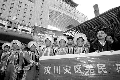 昨天中午1時許,北京西客站北一旅客出站口熱鬧非凡,來自汶川災區的26名羌族演員身穿漂亮羌族服裝,應山寨春晚的邀請,乘火車抵達北京。當老孟帶著山寨春晚團隊與扮演陳毅元帥的特型演員馮黎,前去迎接時,羌族演員手拉手激動地跳起了快樂的鍋莊,唱起了羌族山歌。據悉,山寨春晚已進入倒計時,35個節目最后入選。外地演員已陸續進京,晚會將于除夕夜9時9分開演,由騰訊網現場直播。昨晚起,晚會投入緊張彩排,記者昨天隨老孟前往排練基地,再次探班。