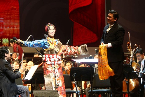 阿斯根演唱完畢向指揮余隆獻哈達