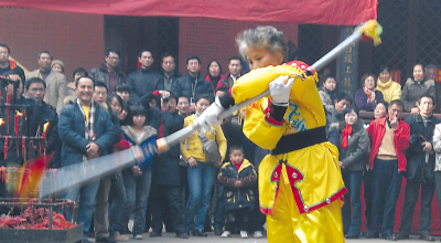 參賽人員中,年齡最大的徐先玉老太今年已72歲,她是著名的“長江大俠”呂紫劍高徒之一。她的3節棍舞得虎虎生威,時而踢,時而戳,時而伏,贏得觀眾一片叫好。據徐介紹,當年她出生3天母親就因病過逝,父親作為國民黨的一名軍官,四處打仗無法管她,她被武功超強的姑姑收養,并拜她為師。有一次,投誠后的父親在監獄里偶然與“長江大俠”呂紫劍相識,遂托他尋找流落在重慶的女兒。