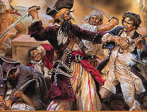 作為加勒比海盜的領軍人物之一,黑胡子見證了加勒比海盜的興起。黑胡子原名愛德華 蒂奇,1680年出生于英國,十幾歲時他便登上一條英國海盜船當了一個小海盜,這條海盜船擁有英國政府頒發的私掠許可證,因此可以在英國政府庇護下攻擊和掠奪敵對國家的商船。成年后,愛德華留起了一臉濃密的黑胡子,有時還會編成小辮,由此他獲得了黑胡子的綽號。據說,他力大如牛、酒量過人,可以在一整天海戰后,豪飲一夜朗姆酒,然后精神百倍地再次投入廝殺;因為嫌烈性的朗姆酒不夠勁,他還常常要在酒里灑上一把火藥。