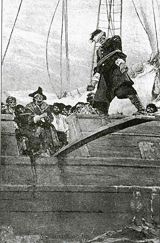 然而現實與藝術表現有著巨大的差距,歷史學家在查閱了浩瀚的史料后得出結論,這種電影里常見的海盜刑罰似乎并沒有在加勒比海時代出現過,唯一一次“走木板”的官方記錄出現在一百年后的1829年,一艘200噸的荷蘭貨船在加勒比海被海盜船截獲,在將貨物搶劫一空后,海盜強迫船員們依次“走木板”蹈海。只有一位船員因交待了財寶藏匿的處所而得到海盜們的寬恕,這位船員輾轉回到歐洲后向人們講述了這次可怕的經歷,于是,“走木板”成為后世藝術作品里海盜們的招牌行徑。