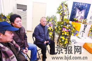張文順先生的靈堂設在天橋樂茶園旁邊的德云書館里,面積不大但布置得整潔肅穆,張文順生前的一張黑白照片擺在靈堂正中,左右兩邊是郭德綱親筆書寫的挽聯,花籃和花圈圍繞著整個靈堂,兩邊的墻上則掛滿了張文順的徒弟張德武、德云社演員何云偉、李菁等人書寫的祭幛。