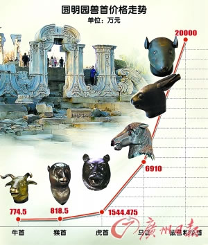 據悉,圓明園十二生肖獸首銅像流散海外近150年來,目前已經有牛、虎、馬、猴、豬五首通過各種渠道回歸中國,鼠首和兔首銅像也已現身,剩余龍、蛇、羊、雞、狗五首至今下落不明。