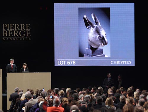 當(dāng)?shù)貢r(shí)間2月25日,佳士得拍賣行在巴黎大皇宮舉辦的“伊夫·圣羅蘭與皮埃爾·貝爾熱珍藏”專場拍賣會(huì)上拍賣圓明園流失文物鼠首和兔首銅像,在不到5分鐘的時(shí)間里,兩件文物分別以1400萬歐元被買家通過同一電話代理人買走。