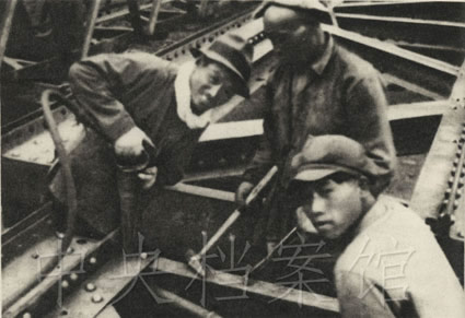 9. 1950年,天津制鋼廠生產模范徐敬生利用廢材做了三百四十多種器材,圖為他和工人們在做新的馬丁爐鋼架