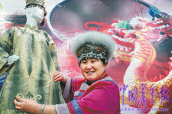 在今年2月北京舉辦的中國非物質(zhì)文化遺產(chǎn)傳統(tǒng)技藝大展上,這件魚皮衣服吸引了無數(shù)眼球。頭戴雪兔毛魚皮帽,腳穿魚皮靴子的尤文鳳,坐在展臺(tái)前,不厭其煩地回答著觀眾的問題。