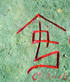 在蓮花山桃花源的巨大的紅砂巖上,5000多個甲骨文字按照它們現(xiàn)代漢語意思的音序排列著,雕刻的面積有50m×100m大。荊鴻說,這些甲骨文字是他幾十年來研究收集的,也是他的甲骨文字典里面的全部文字,荊鴻說,這是刻在石頭上的“摩崖字典”。