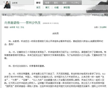 而今,汶川地震周年紀念將至。2009年5月10日,余秋雨更新自己在新浪所開設的博客,文章主題即是地震。在這篇題為“向香港請假——答林汐先生”的博文中,余秋雨以答問的方式,談了自己對汶川地震的一些看法。