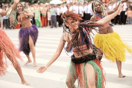 第二篇章“異國風(fēng)情”中,毛里求斯和巴基斯坦表演隊排練得很投入,當(dāng)頭戴紅花、身著艷麗花朵大擺裙的非洲美女一上場,便吸引了現(xiàn)場男士們的視線。伴隨著歡快的音樂,姑娘們翩翩起舞,不停擺動小蠻腰來回旋轉(zhuǎn)舞動,撩動裙擺露出迷人雙腿,她們臉上的太陽、月亮圖騰展現(xiàn)了原始的舞蹈魅力。除了這兩支隊伍,哥倫比亞民間舞、蘇格蘭風(fēng)笛、俄羅斯民間舞、泰國舞也將亮相天府大巡游。