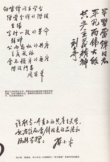 大約過了兩三天,《中國青年》雜志編輯部的同志打電話到毛主席辦公室,詢問主席是否已經答應寫題詞。當時,我了解毛主席已經看過《中國青年》雜志的信,但未作什么表示,我便如實地轉告。他們說,《中國青年》雜志在3月1日出版,能否請主席在2月25日前寫好,因為印刷還需要一周的時間。我將他們的要求報告了毛主席。毛主席讓我先擬幾個題詞供他參考。我回辦公室,思索了一番,擬好了十來個題詞,立即送給他。我現在還可以回憶起幾個題詞的大致內容。如:“學習雷鋒同志全心全意為人民服務的思想”、“學習雷鋒同志鮮明的階級立場”、“學習雷鋒同志艱苦樸素的作風”、“學習雷鋒同志毫不利己專門利人的優良品德”,“學習雷鋒同志勤奮好學的精神”等等。