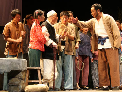 2005年9月6日至8日,由中國文聯主辦的紀念中國人民抗日戰爭暨世界反法西斯戰爭勝利60周年優秀劇目展演抗戰獨幕劇專場在中央戲劇學院實驗劇場上演。91歲高齡的山尊老不僅擔任專場演出的總策劃,還在《求雨》中扮演一個回族老人宋大爺,這個形象設計是為了表現全國各族人民團結一致抗戰的決心。由于老人家年事已高,而在劇中還有一個磕頭的場面,因此在人物設計上,將由一個“小孫女”攙扶上場。當大家關心他是否一定要出演這個動作時,老人說:“磕頭這個場面我一定要演,而且可以演,但是在起身的時候,可能要人扶一把。”他的敬業精神感動了所有年輕的演員。本報組織員工專門到劇場觀看了這場演出,山尊老對藝術的執著精神和要牢記歷史、珍愛和平的諄諄教導讓大家非常感動。演出結束后,報社向山尊老敬獻了花籃,祝福老人家健康長壽、藝術生命長青。山尊老欣然與大家合影留念,并高興地說,謝謝報社對我的關心,謝謝你們!