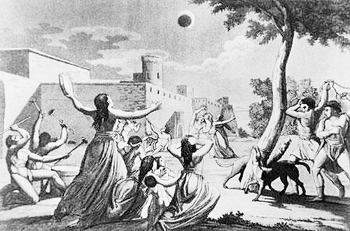 一天,兩軍對陣,激烈的廝殺一直持續到太陽偏西。忽然,士兵們發現,一個黑影闖入圓圓的日面,把太陽一點點吞食,眩目的太陽光盤逐漸減少,大地的亮度慢慢減弱,好像黃昏提前來到。隨即,太陽全被吞沒,頓時天昏地暗,仿佛夜幕突然降臨,一些亮星在昏暗的天空中閃爍。士兵們從來沒見過這種景象,驚得目瞪口呆,停止了廝殺。