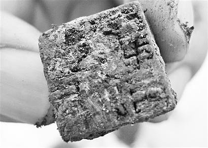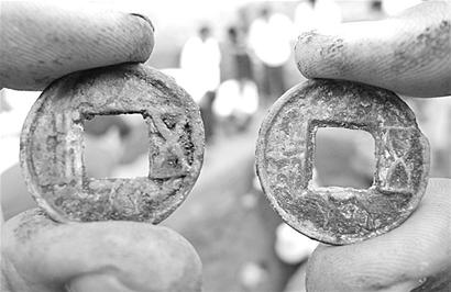 考古人員的動作越來越輕,墓葬的北頭、中部不斷有銅錢被發掘出來。經現場的考古人員確認,這些都是漢代的五銖錢。記者看到,這些方孔銅錢上的“五”、“銖”兩字十分明顯。