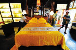 東長房觀眾服務區,工作人員在整理故宮特色商品,僅有一套的云錦緙絲寢具(五件套)標價888888元。與30元一碗的面相比,這套云錦緙絲寢具才是真正的天價。
