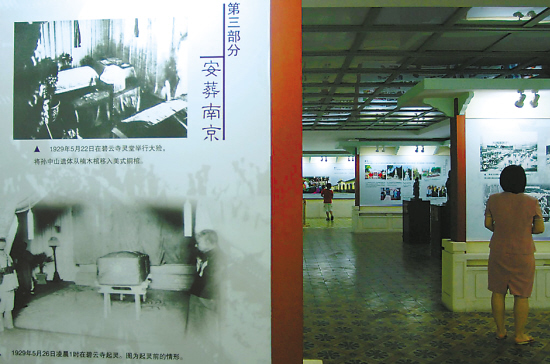 根據展示的圖片還得知,孫中山先生的遺體曾經4次易棺。第一具棺柩是由協和醫院院長劉瑞恒選用的一具美式小棺,作為孫中山逝世后臨時之用,后因太小,只用了幾天。抗日戰爭爆發后,奉安紀念館被日軍炸毀,這具美式小棺也不知去向。第二具棺柩則是由前蘇聯政府特地贈送的一具水晶棺,但北京協和醫院的專家們認為水晶棺質料脆薄,易于傳熱不利于防腐,因此沒有使用,現保存在北京香山碧云寺內。第三具棺柩為橢圓形的楠木棺,內襯鉛里,滿貯福爾馬林藥液,孫中山遺體置于藥液中,上面有玻璃隔板,可供人瞻仰。1929年5月22日,孫中山先生的遺體在碧云寺靈堂舉行移靈大殮時,將遺體從楠木棺移入第四具棺柩。最后安放的第四具棺柩是由南京國民黨政府葬事籌備處在美國訂購的美式銅棺,當時造價為1.5萬兩白銀。1929年6月1日“奉安大典”時,這具美式銅棺被葬入中山陵孫中山臥像下5米深的長方形墓穴里。
