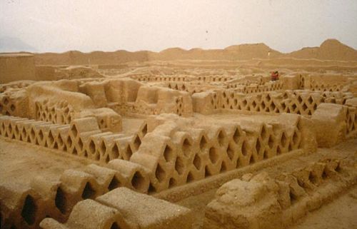 昌昌古跡位于太平洋海岸,是奇穆文明(Chimúcivilization)的首都。奇穆文明大約始于公元850年,消亡于1470年。土城城區是帝國的權力中心,帝國從厄瓜多爾南部延伸到秘魯中部,綿延1000多公里。15世紀時城市的居民達6萬人,大部分是工人,服務于極權君主,還有高級手藝人和神父。那是個嚴格的世襲等級社會:奇穆神話說,太陽用三個蛋創造了人類,金蛋孵出了統治者,銀蛋孵出了統治者的妻子,銅蛋孵出的是大眾。