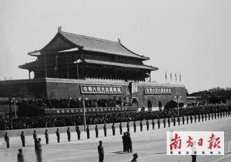 隨后,毛澤東等領導人乘車出中南海東門,從故宮西華門南拐至闕右門,再往南直達天安門,登上了城樓的一百級臺階……