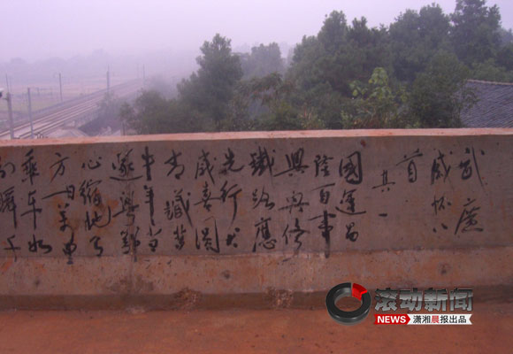 “太有才了!如此流暢的書法作品,的確為鐵路建設增色不少。”網友“龍太賢”在紅網論壇發《水泥墻上見功底武廣橋上一奇葩》,帖中曝料他在武廣高速鐵路客運專線上的一跨線橋的擋墻上,拍到建橋人如行云流水一般的書法作品。據當地知情人說,這些書法作品是其中一位承建包工頭建完橋后有感而書的。