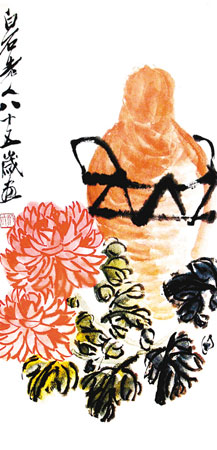 齊白石以花鳥畫見長,他善于將民間藝術的審美情趣融進傳統文人畫,以質樸率真之氣開創了文人畫的新境界,畫面洋溢著活潑的生命力,極具明朗、清新之美,充滿了泥土的芳香。技法上,他注重用筆的蒼勁老辣與方折勁挺,筆力雄健,揮寫自如;墨法則講究單純準確,對干濕濃淡的搭配關系極力經營;用色則大膽而濃艷,吸收民間美術的敷色特點,卻艷而不俗;構圖上,他多以簡潔之圖,塑花、鳥稚拙之美,但一些作品則極力刻畫蟬、蝶、蟋蟀等小昆蟲,寫實程度足可亂真,與大寫意花卉相配,別具情趣。