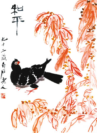 《和平鴿》是一幅以動物為主體的上乘之作。齊白石一生對生活充滿熱愛,其筆下花鳥蟲魚,乃至蟬、蝶、蟋蟀等小昆蟲,皆充滿情趣,寄托和凝聚著他內心的天真與童趣。鴿子是白石老人很喜愛的題材,他曾親自飼養鴿子,觀察其體態神韻,創作態度嚴謹。該畫右側是一叢鮮艷的雁來紅,兩株并立,一株斜插,枝葉披紛,繁而不亂。在紅花之下,站立著一只通體漆黑、紅嘴紅爪的和平鴿,雙目圓睜,回首眺望,極顯精神。鴿子雖是大寫意畫法,但結構造型精準。此畫僅黑紅二色,卻營造了熱烈而穩重的氛圍。題款“和平、九十二歲白石老人”不僅點明主題,而且在全畫以“面”為主的構圖中,制造了“點、線”元素,使作品形式更為豐富。