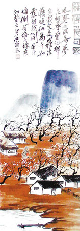 白石老人以花鳥創作為主,但也偶作山水,并能把花鳥畫的一些技法運用到山水畫中,別有清新明快之感。《羅浮覓句圖》是一幅精彩的山水畫作品,此作取全景式構圖,布局宏大:遠處羅浮山巍峨聳立,設色單純明快,虛實相映,凸顯空間之感;山下赭色的坡地上則是梅林如海,白梅綻放,梅香陣陣;林中屋舍隱顯,高士攜童覓詩;近景水波微瀾,渡頭空曠,具有濃郁的文人情懷。該畫的技法簡捷,沒有傳統山水畫的“勾、皴、染、點”的繁復創作程式,而是以大寫意手法縱筆平涂,別具簡約質樸的生活情趣。在色彩上,大片泥土的赭石紅,也與遠山淺藍綠的花青色形成鮮明對比,顯得非常精神。題詩“風寒冬深無夢來,相尋曾記那年栽;定是羅浮舊蜨仙,萬千如雪向我開”,詩畫相配,令人心馳。