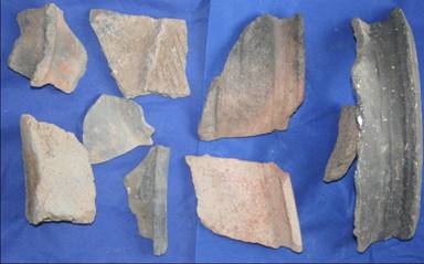另在遺址東部的取土坑內暴露一陶窯遺跡,陶窯開口距地表1米,窯的剖面為半圓形,直徑2.3米,殘高0.8米,底部紅燒土厚4厘米,上部灰燒土厚3厘米,窯內由磚塊、燒土塊,灰土、繩紋灰陶罐片等。地表散落有大量的遺物。