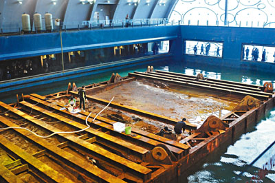 博物館主場南海一號古船所在的沉箱,考古隊員正進行一場水下考古挖掘的動態演示。經過幾天的放水調試,沉箱的其中兩個探方已微露船舷。據稱,沉箱仍不會立即打開,這是為了保護古沉船的微環境。考古人員將采取逐層打開的措施,一點一點地發掘,同時,也有3名蛙人在水下作業。