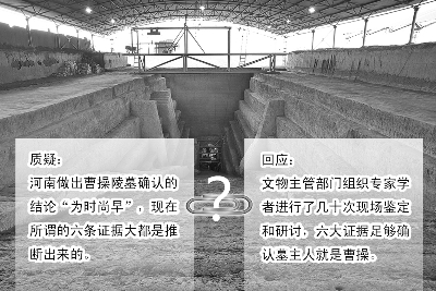 對于學者質疑,河南省文物局副局長、新聞發言人孫英民進行了回應。他表示,曹操陵墓本身爭議很大,河南省文物局對于曹操陵墓的確認和發布非常慎重——從2009年10月開始發現有證據表明可能為曹操陵墓后,國家文物主管部門先后組織了歷史學、考古學、古文字學、人骨鑒定方面專家學者,進行了幾十次現場鑒定和研究討論,最后得出的結論是,目前掌握的六大證據,足夠確認墓主人就是曹操。河南省文物局根據專家意見,報經國家文物局同意之后,對外統一發布了曹操陵墓確認的消息,整個過程是嚴謹和慎重的。