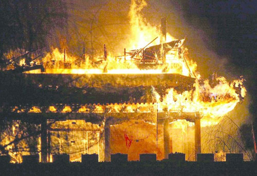 記者從正定縣旅游局及相關方面了解到,大火起于18日晚8時19分,起火點位于樓閣頂層的飛檐上。火情發生后,正定消防部門立即出動全力滅火,石家莊的消防部門也趕去支援,現場一度聚集了十六七輛消防車。由于起火點位置較高,加之木質結構火勢蔓延較快,救援有些力不從心。大火在燃燒了兩個半小時后被撲滅,此時,城門樓上的兩層樓閣已完全化為灰燼。