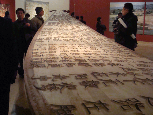 中國美術館的7號展廳中央圍了層層的觀眾,觀眾的包圍圈中是一艘甲板上刻滿漢字的木船,船的形狀好像一片樹葉,船體流暢的線條有搖曳之感,加上船頭的琴拴設計,俯視船身正面又好像一把古老的中國樂器。