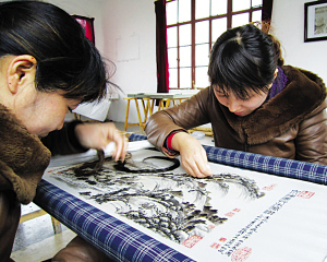 今年“兩會” 期間,溫家寶總理在記者招待會上借《富春山居圖》合璧的話題,表露了華夏兒女期盼祖國統一的心愿。這個信息使江蘇東臺市的工藝美術工作者大為觸動。因為早在2008年,當地的兩個美術師和8位繡娘歷時9個月曾制作了發繡作品《富春山居圖》,畫面藍本是原畫的后半部分《無用師卷》,這部作品在當年的第八屆中國工藝美術大師作品暨中國工藝美術精品博覽會上獲得了金獎。