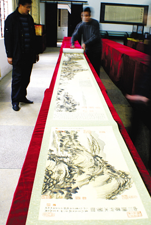 記者昨天在東臺發繡藝術館看到了合璧的發繡《富春山居圖》,裝裱后的全幅畫外徑寬40厘米,長1388厘米。