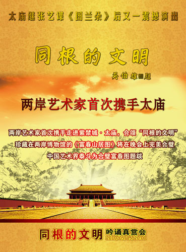 負責推廣這次活動的環球活動網創始人歐陽國忠說,舉辦《同根的文明》吟誦真賞會的意義在于:在鶯歌燕舞、春暖花開、繁花似錦的五月,通過詩歌朗誦的形式,著力展現兩岸館藏珍貴藝術品,弘揚中華民族的傳統文化;在兩岸關系日益升溫的大背景下,以溫總理兩會所提的《富春山居圖》為切入點,尋找兩岸之間的文化紐帶,表現中華民族的文化團圓。